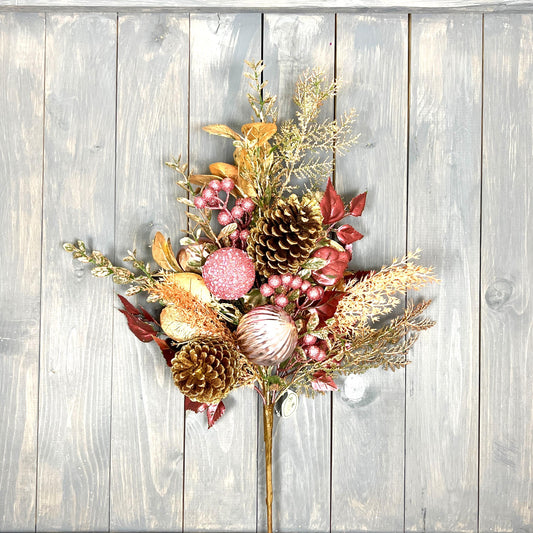 32" Pink and Gold Glitter Leaf Berry and Cone Spray, Gold Glitter Leaf Spray with Pink Berries and Ornaments, Pine Cone and Berry Stem