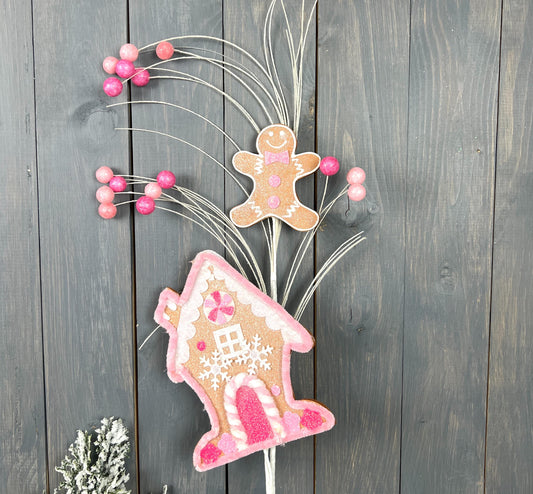 30" Whimsical Gingerbread House and Man Spray, Pink & White Accents, Holiday Floral Decor, Glittered Christmas Tree Decoration