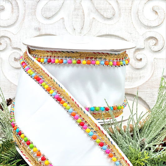 White Beaded Edge Ribbon, 4 Inch Jeweled Designer Ribbon, Gold Trim with Rainbow Beads, Wired Holiday Wedding Craft Ribbon