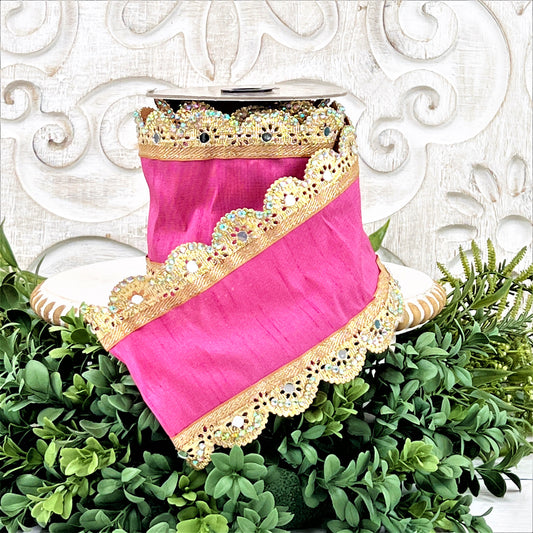 Pink Jewel Trim Ribbon, Pink and Gold Ribbon, Pink Easter Ribbon, Pink Ribbon with Gold Lace Trim, D Stevens Ribbon, Valentines ribbon