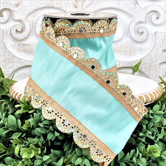 Teal Jewel Trim Ribbon, Teal and Gold Ribbon, Aqua Christmas Ribbon, Aqua Ribbon with Gold Lace Trim, D Stevens Ribbon, Designer Ribbon