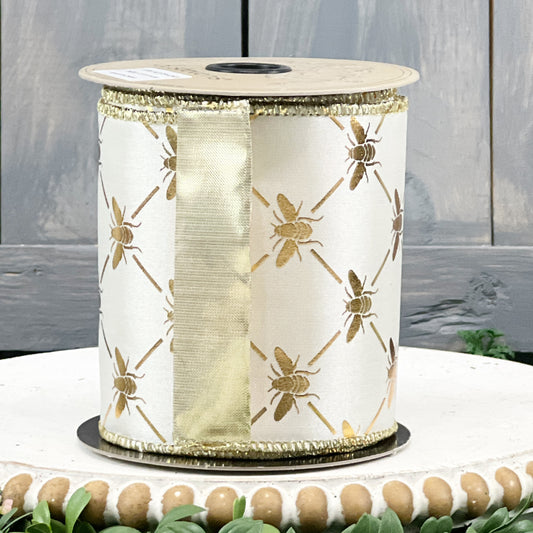 White and Gold French Bee Ribbon, D Stevens Bee Ribbon, White Taffeta with Metallic Gold Bees Ribbon, White and Gold Bee Ribbon,