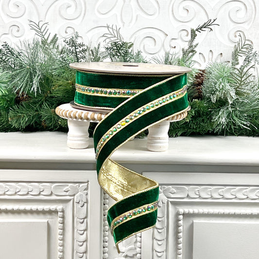 D Stevens Emerald Green Jeweled Velvet Ribbon, Jeweled Velvet Christmas ribbon, Green and Gold Holiday Ribbon, 2.5" Wired Velvet ribbon,