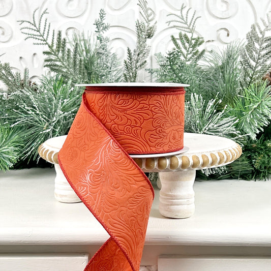Rust Orange Floral Embossed Ribbon, Orange Fall Ribbon, Floral Ribbon, Autumn Floral Embossed Ribbon, Rust Orange Wedding Decor