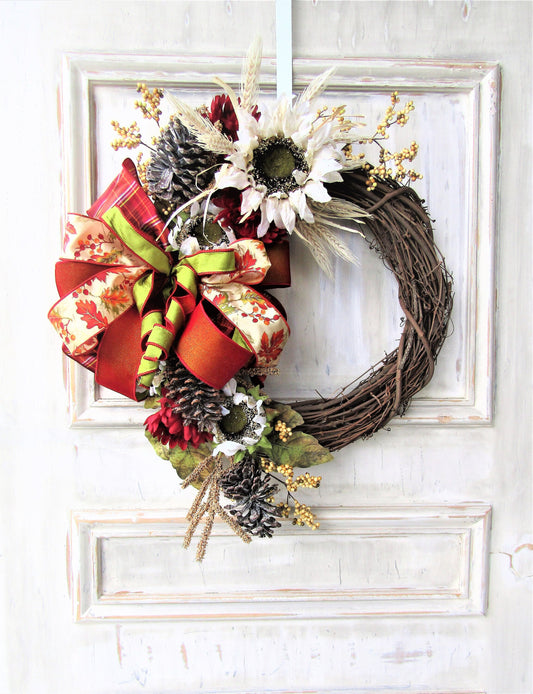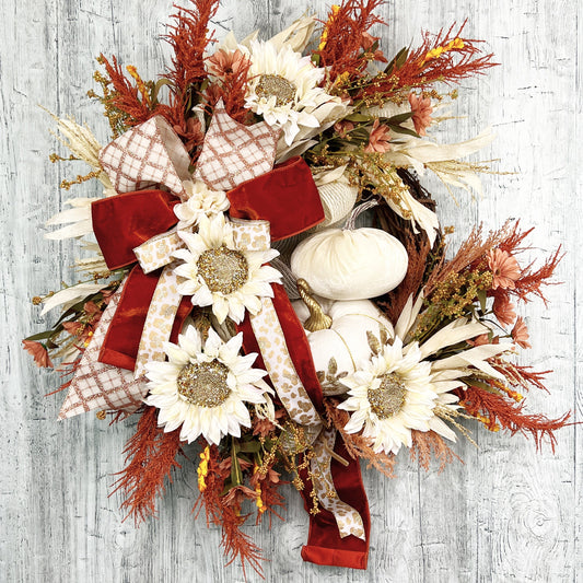 Large Fall Wreath for Front Door, White Pumpkin Wreath, Fall Sunflower Wreath, White Sunflower Wreath, Autumn Wreath, Boho Wreath
