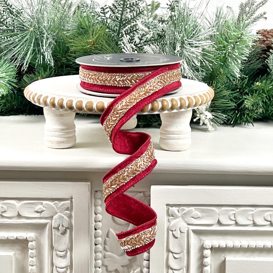 Red Jeweled Ribbon, Farrisilk Burgundy Jeweled Ribbon with Gold Accents, High-End Designer Wired Ribbon for Special Occasions & Decor
