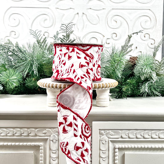 Farrisilk Candies Ribbon - Luxury Chenille Christmas Ribbon in Candy Cane and Peppermint Design