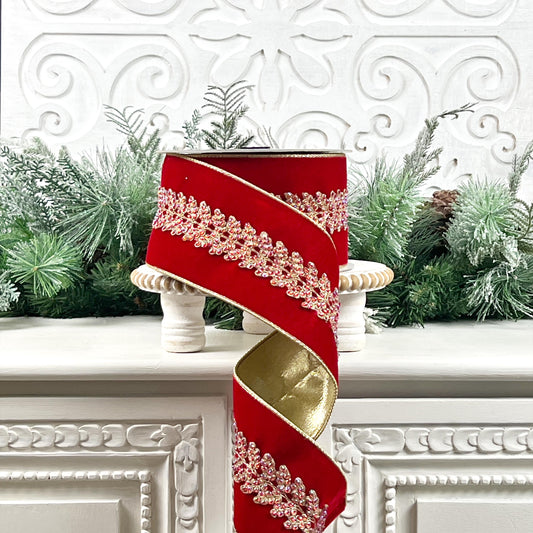 Farrisilk Enchanted Vine Jeweled Red Velvet Ribbon - Luxurious Wired Red Christmas Decor