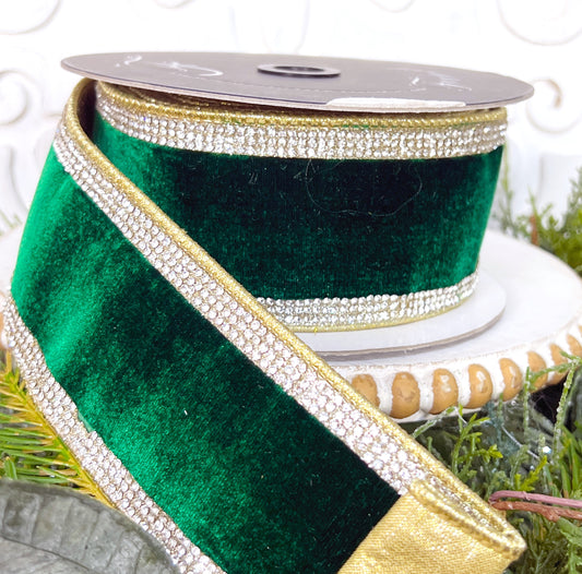 Farrisilk Emerald Green Winter Diamonds Ribbon - Jeweled Velvet Rhinestone Trim for Elegant Decor