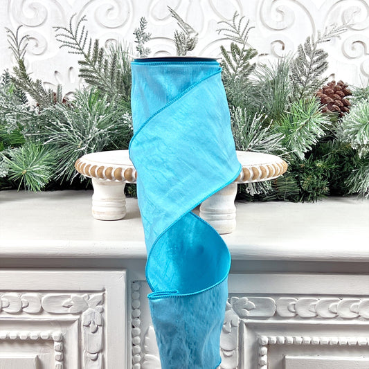 Aqua Blue Dupioni Ribbon, 4 Inch Wired Designer Ribbon, Elegant Silk-Style Trim, 10 Yard Roll for Wreaths and Decor