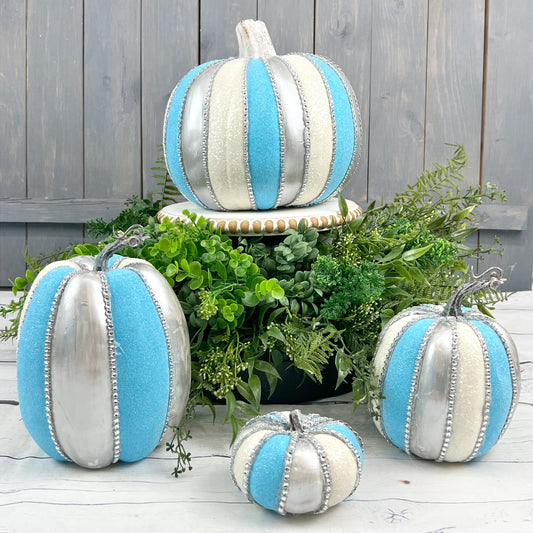 Fairytale Jeweled Pumpkin Set, Blue Silver Glittered Pumpkins - Fall Home Decor