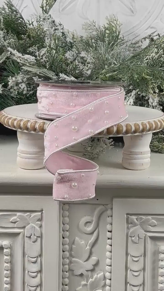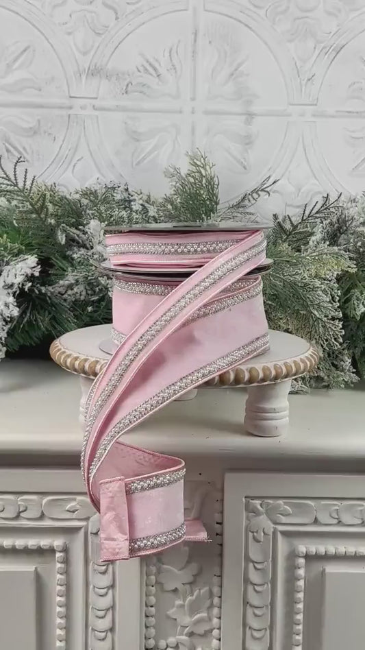 Pink Velvet Ribbon with Pearl and Rhinestone Trim, Elegant Designer Ribbon, Luxury Holiday and Wedding Decor