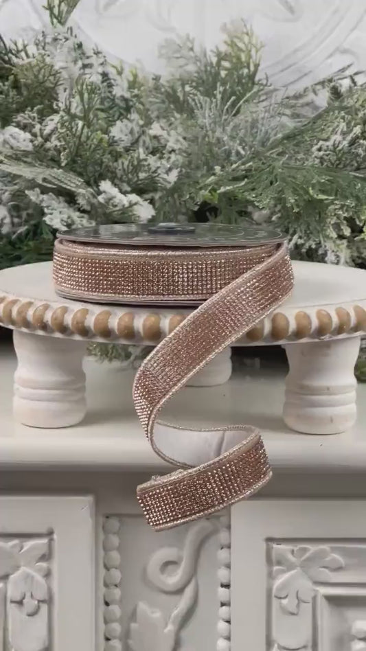 Champagne Rhinestone Ribbon, Ivory Dupion Ribbon with Rhinestone Trim, Elegant Designer Ribbon for Holiday and Wedding Decor