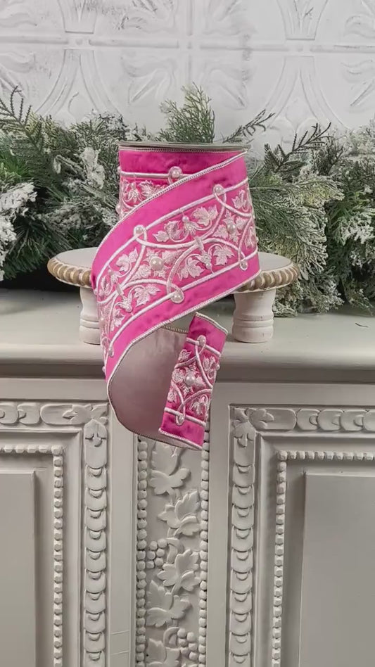Embroidered Pink Velvet Pearl Ribbon, Pink and White Designer Ribbon, Elegant Luxury Ribbon for Holiday and Wedding Decor