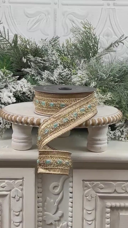 Farrisilk Light Blue Gold Ribbon, Velvet Tinsel Holiday Ribbon, Christmas Wreath and Tree Trimming Ribbon