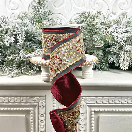 Nancy Brown Gray and Burgundy Jeweled Velvet Ribbon - Luxurious Designer Ribbon for Elegant Décor