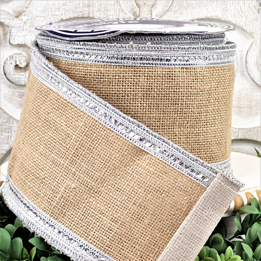 Burlap Ribbon, Silver Ribbon, Sequin Ribbon, Jeweled Ribbon, 4 Inch Wired Ribbon, Christams Ribbon, Farrisilk Ribbon, Rustic Ribbon