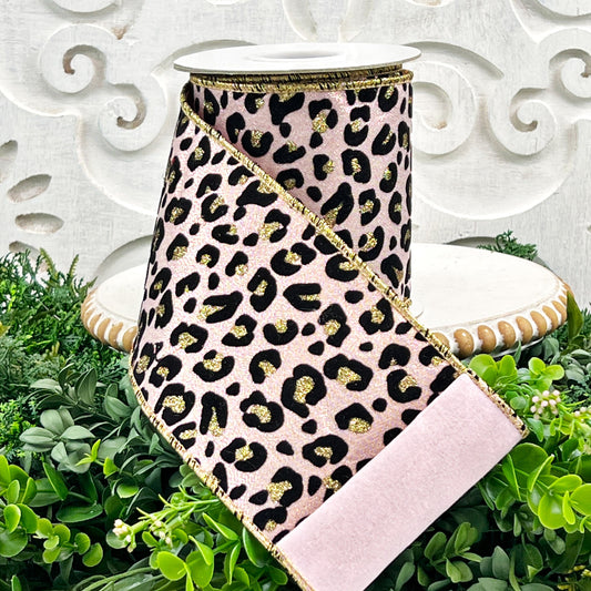 Rose Gold Glittered Leopard Ribbon, 4" Pink and Black Ribbon, Glitter and Velvet Cheetah Ribbon, Rose Gold Ribbon, Wired Leopard Ribbon
