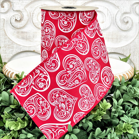 Valentines Day Ribbon, Red Heart Ribbon, White Bandana Heart Ribbon, Heart Ribbon, 4 Inch Wired Ribbon, Designer Wedding Ribbon