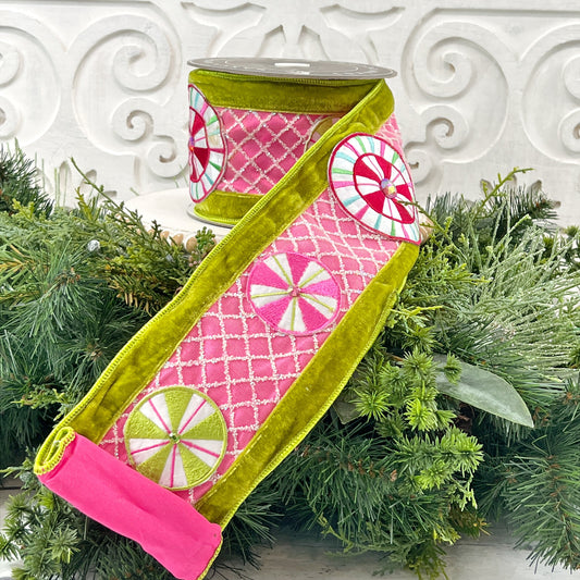 Pink and Green Velvet Embroidered Ribbon, Holiday Candy Ribbon, Pink/Lime Xmas Ribbon, Peppermint Ribbon, Jeweled Velvet Ribbon,