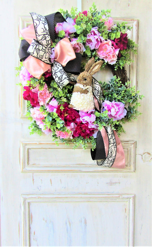 Bunny Wreath for Front Door, Pink Peony Wreath, Spring Wreath, Mothers Day Gift, Farmhouse Wreath, Front Porch Decor, Nursery Decor