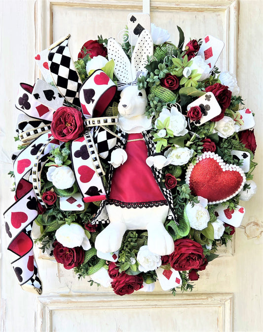 Queen of Hearts Wreath, White Rabbit Wreath, Easter Bunny Wreath, Easter Decor, Playing Card Wreath, Red Rose Wreath, Valentines Wreath