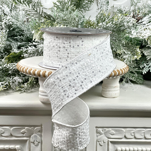 Nancy Brown White Tweed Sequin Ribbon - Luxury Wired Ribbon for Elegant Home and Holiday Decor - Jeweled Ribbon, White Christmas Ribbon