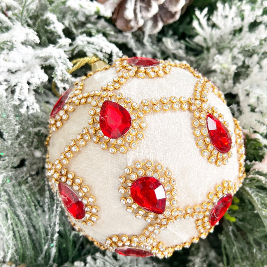 Elegant Ivory and Red Jeweled Velvet Christmas Ornament - Holiday Home Decor, Jeweled Ball Ornament, Red and Gold Ornament, Holiday Bling